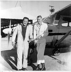 Verne Williams and Howard Curtis pass the baton on the ground just after the skydive on Jan. 23, 1960.